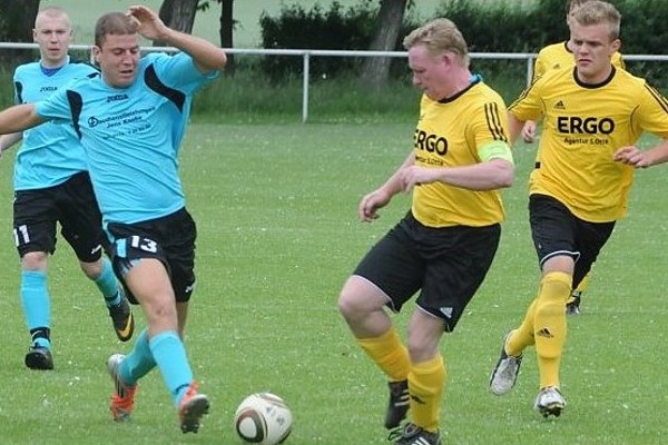 TSG-Stürmer Kevin Fenzl (l.) blieb oft an FSV-Abwehrchef Maik Wohlfeil (2.v.r.) hängen. | Foto: N. Wulf