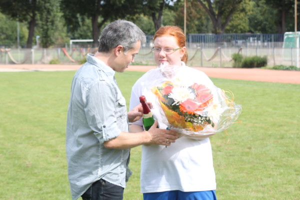 Janine Wende überbringt den großen Dank ihrer Mannschaft in Form von Blumen und Sekt. | Foto: Verein
